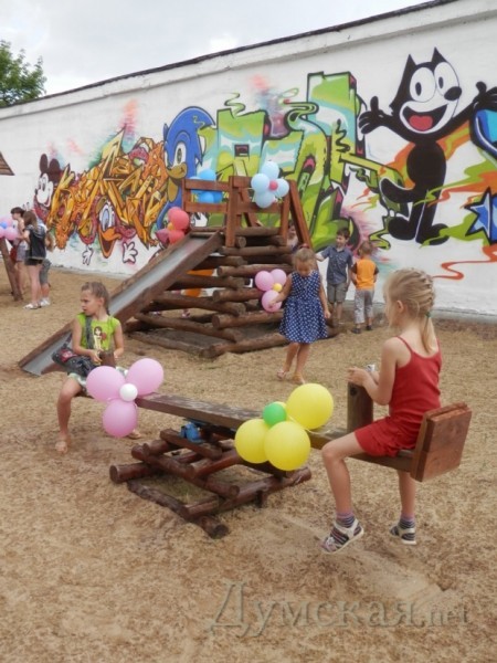 Как выяснилось, детский городок на улице Нежданова подвергался атаке вандалов уже четыре раза – хулиганы то громили качели, то воровали части конструкций, то разрисовывали стену прилегающего здания. Команда депутата Одесского горсовета Дмитрия Пеструева взяла шефство над площадкой и восстановила детский городок. «То что один может поломать, другой может построить заново, так что бороться с вандалми можно только своим положительным примером. А чтобы их не было, важно правильно воспитывать своих детей», — говорит Дмитрий Николаевич. Чтобы хулиганам не повадно было уродовать стену дома около площадки, над ней поработали профессиональные граффитчики.