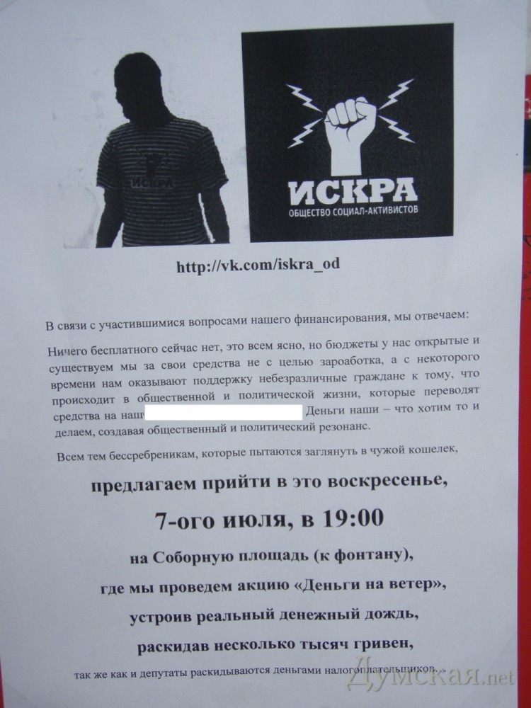 Движение «Общество социал-активистов «Искра» намерено провести акцию под названием «Деньги на ветер». В объявлениях, которые молодые люди расклеили на улицах города, отмечается, что такая необходимость возникла «в связи с участившимися вопросами о финансирования организации». «Деньги наши – что хотим, то и делаем, создавая общественный и политический резонанс. Всем тем бессребреникам, которые пытаются заглянуть в чужой кошелек, предлагаем прийти в это воскресенье на Соборную площадь, где мы устроим реальный денежный дождь, раскидав несколько тысяч гривен», — говорится в объявлении. СМЕРТЬ РОСІЙСЬКИМ ОКУПАНТАМ! Помітили помилку? Виділяйте слова з помилкою та натискайте control-enter |