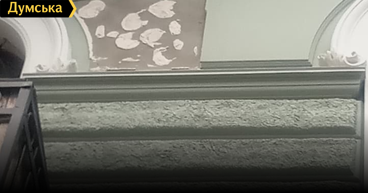 Только что отреставрированный за бюджетный счет памятник архитектуры — дом №13 по Софиевской, уже осыпается. С него падают кое-как приклеенные «реставраторами» куски фасада. Ремонт фасада и кровли этого бывшего доходного дома, построенного в 1890-м году по заказу знаменитого бизнесмена Александра Руссова (того самого) начался еще в 2011 году, но был остановлен, как и вся «фасадная программа». В 2017 реставрацию возобновили, потратив на нее больше 4 млн грн. Подрядчиком была фирма «Реставратор-1946», входящая в группу «Инкор» Руслана Тарпана. Фото Дениса Шацило СМЕРТЬ РОСІЙСЬКИМ ОКУПАНТАМ! Помітили помилку? Виділяйте слова з помилкою та натискайте control-enter