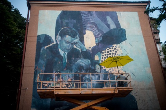Художник Марат Морик создает граффити с изображением шахматиста на стене дома №9 по Отрадной улице в Одессе.