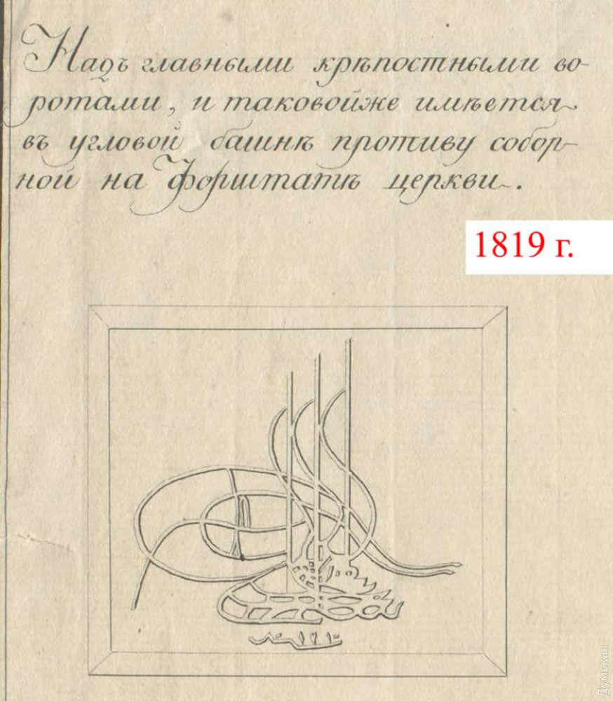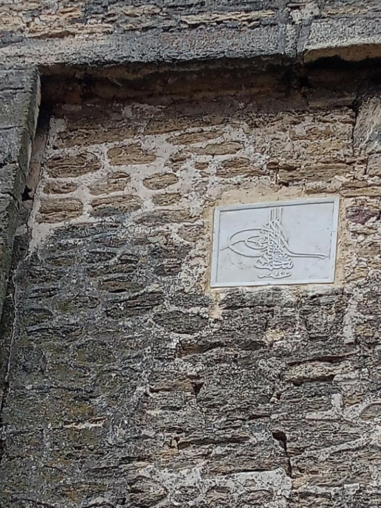 Первая плита вернулась на фасад воротной башни, что над входом в крепость. На ней изображена тугра (личный герб) султана Османской империи Селима III, а также дата «1796 г.». Эта плита маркирует окончание самой масштабной модернизации крепости турками по проекту знаменитого французского инженера Франсуа Кауффера (автора первого инструментального плана Стамбула, тайного российского агента и разведчика).
