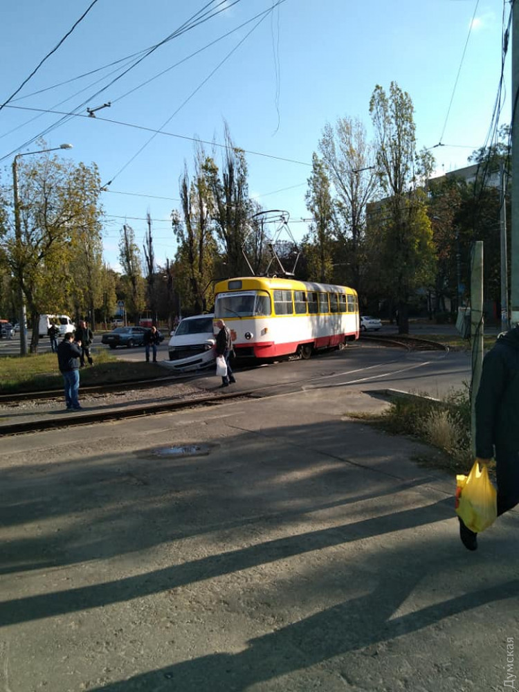 Как сообщили «Думской» в пресс-службе КП «Одесгорэлектротранс», ДТП произошло во время захода трамвая на разворотное кольцо. Автомобиль «Фольксваген» не уступил дорогу многотонной махине, и произошло столкновение. Иномарка получила серьезные повреждения, а трамвай одной тележкой сошел с рельсов. На место выехал кран, чтобы ликвидировать ситуацию.