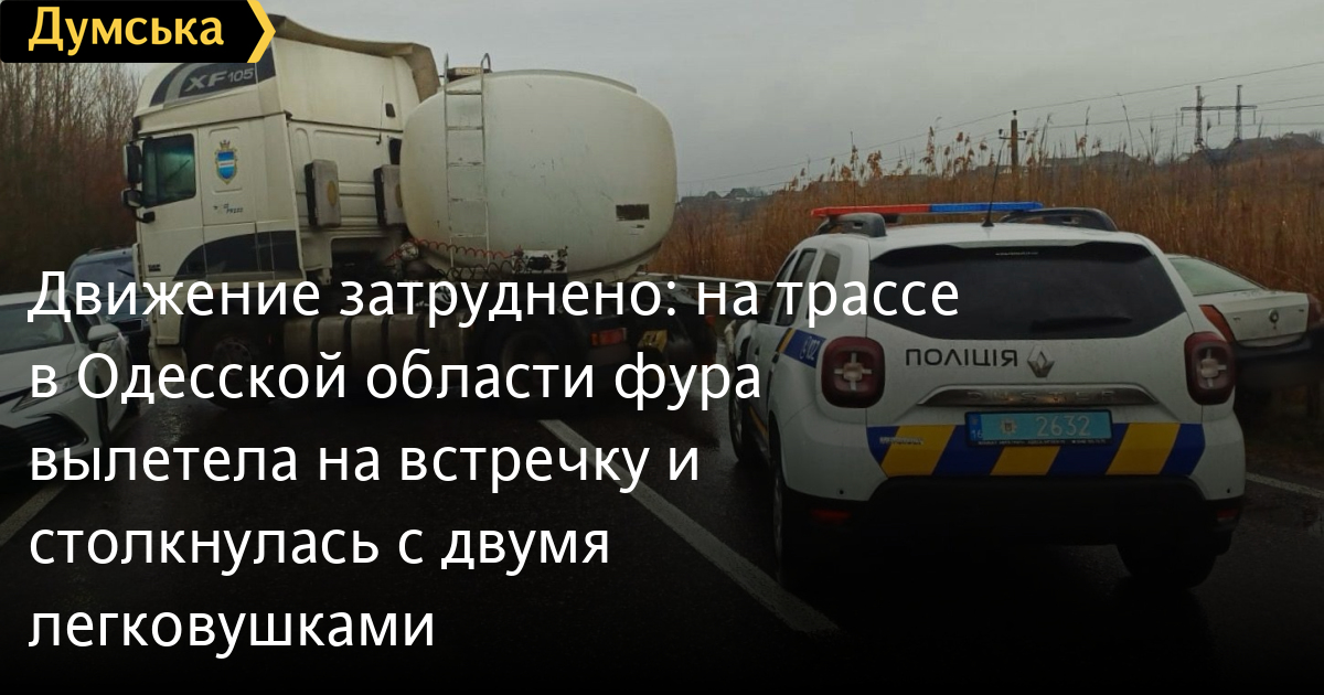 Рух ускладнено: на трасі в Одеській області фура вилетіла на зустрічну смугу і зіткнулася з двома легковикамиЧерез аварію ускладнено рух транспорту на транзитній ділянці траси Одеса-Рені між Паланкою та Удобним. Як повідомили в поліції регіону, водій вантажного автомобіля DAF, що рухався в бік Одеси, виїхав на зустрічну смугу і зіткнувся з двома легковими машинами. По медичну допомогу звернувся водій однієї з легкових машин. Обставини аварії встановлюють правоохоронці. Рух транспорту на ділянці між Паланкою та Зручним ускладнений. Водіїв просять зважати на дорожню обстановку. Помітили помилку? Виділяйте слова з помилкою та натискайте control-enter |