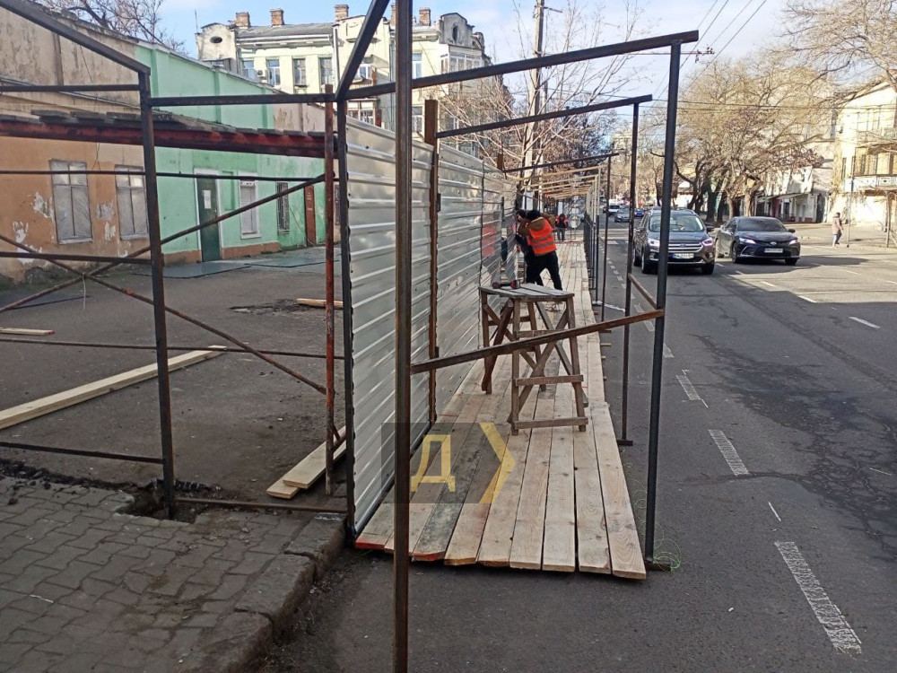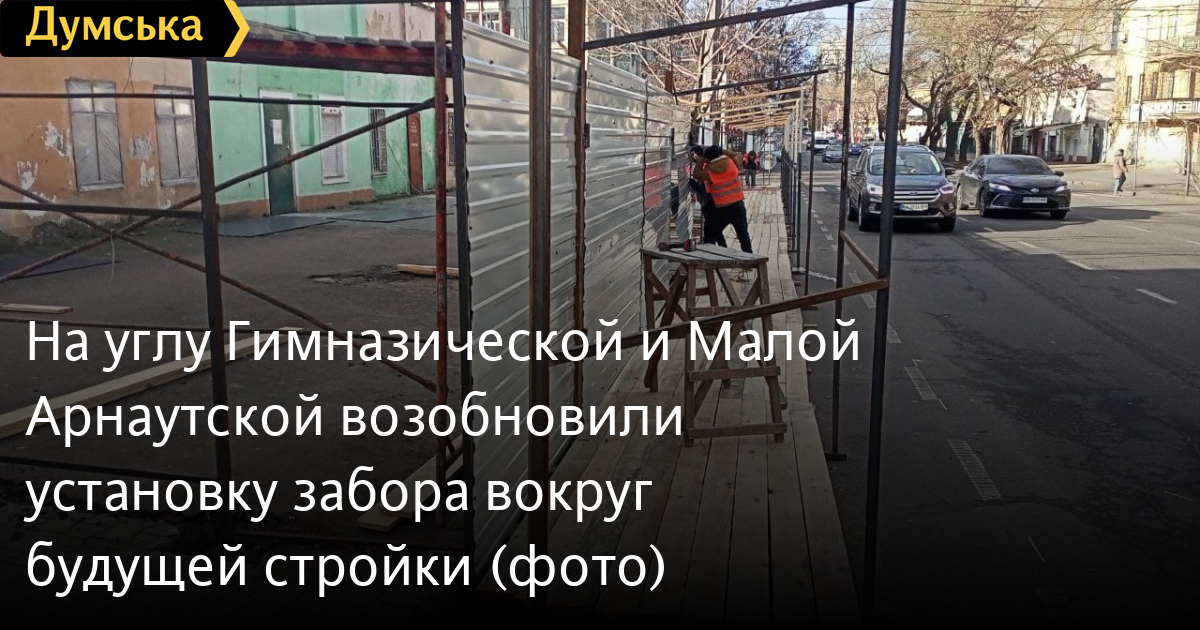 Рабочие продолжили установку забора возле участка на пересечении улиц Гимназической и Малой Арнаутской, где в ближайшее время планируется строительство семиэтажного жилого дома.