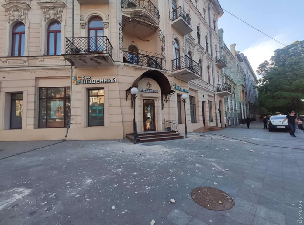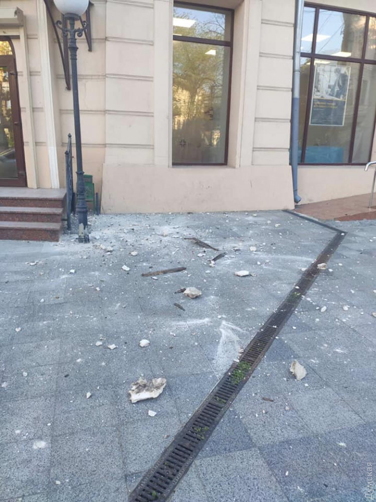 Большой кусок лепнины упал сегодня с фасада относительно недавно отреставрированного памятника архитектуры, расположенного на углу Преображенской и Елисаветинской (Елисаветинская, 18/ Преображенская, 13).