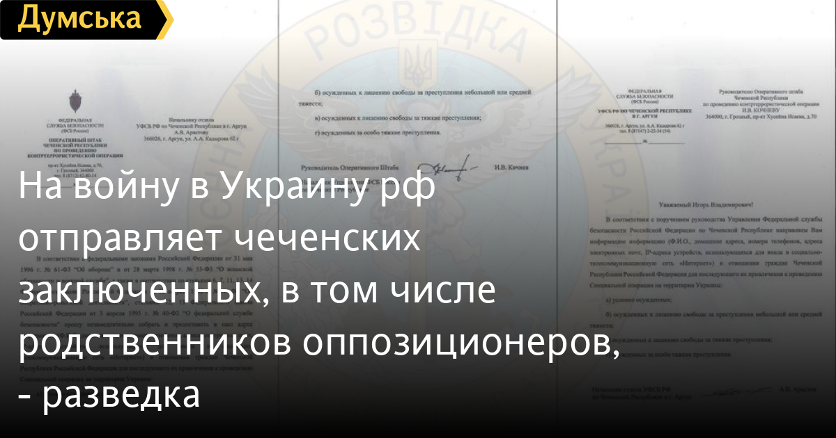 На войну в Украину рф отправляет чеченских заключенных, в том числе родственников оппозиционеров, — разведкаЧеченский филиал ФСБ собирает информацию о заключенных местных тюрем для их дальнейшей отправки в зону боевых действий в Украине. Переписку должностных лиц ФСБ обнародовало Главное управление разведки Министерства обороны Украины. В письмах речь идет о необходимости предоставить личные данные осужденных, в частности: ФИО, домашние адреса, номера телефонов, адреса электронных почт, IP-адреса устройств, используемых для входа в «социально телекоммуникационную сеть Интернет». «Немедленно собрать и предоставить в наш адрес информацию о гражданах Чеченской республики РФ для дальнейшего их привлечения к проведению специальной операции на территории Украины: а) условно осужденных; б) осужденных к лишению свободы за преступления небольшой и средней тяжести; в) осужденных к лишению свободы за тяжкие преступления; г) осужденных за особо тяжкие преступления», — говорится в одном из документов. По словам чеченских оппозиционных общественных деятелей, такие действия имеют две цели. Во-первых, восполнить «человеческий ресурс» частей, понесших значительные потери в боях с украинскими защитниками. Во-вторых, подавить любые протестные настроения в Чечне. Ведь сейчас там распространена практика осуждения родственников оппозиционеров. Теперь им грозит принудительная отправка в самые горячие точки фронта. В частности, брата известного чеченского оппозиционера Хасана Халитова уже доставили в одну из частей на передовой. Других родственников Халитова похитили и их местонахождение неизвестно. СМЕРТЬ РОССИЙСКИМ ОККУПАНТАМ! Заметили ошибку? Выделяйте слова с ошибкой и нажимайте control-enter |