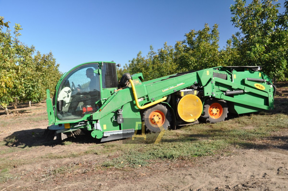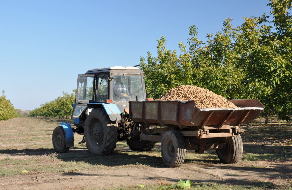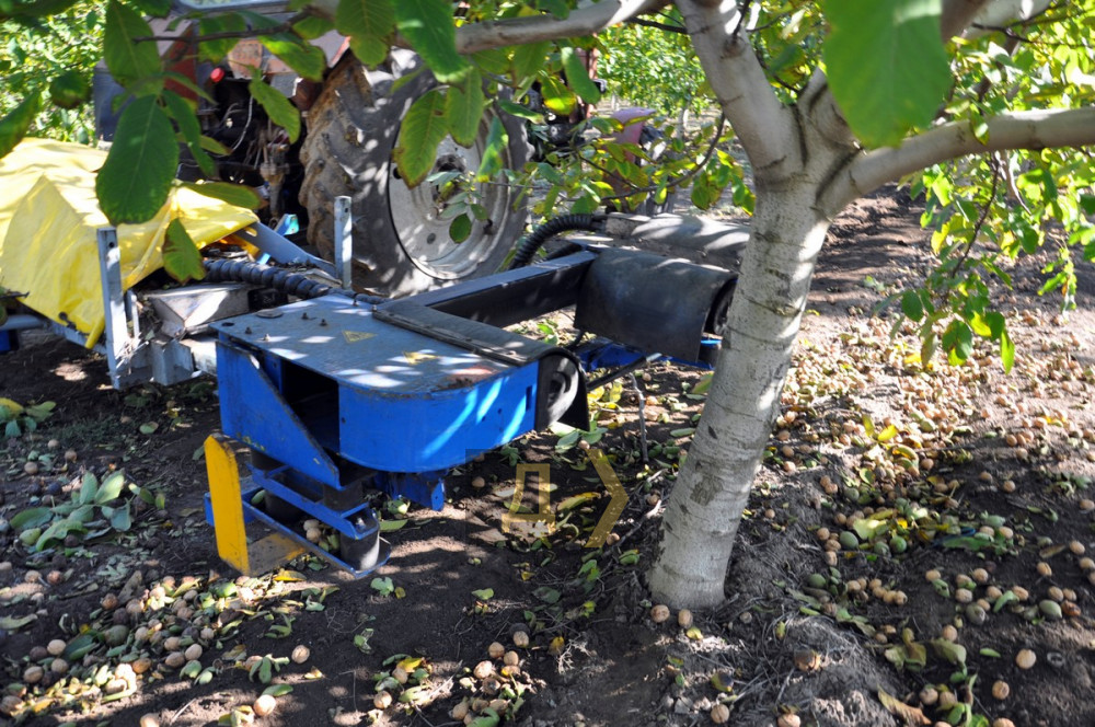 В ореховом саду Андрея Гука сейчас оживленно – здесь собирают урожай. Шейкер идет вдоль ряда, старательно отряхивая орехи с деревьев. Следом за ним движется орехоуборочный комбайн, собирающий опавшие плоды. Когда контейнер наполняется, орехи высыпают в кузов грузовика. Поскольку орехи спеют неравномерно, то каждый ряд деревьев обрабатывается техникой дважды – с недельным перерывом.