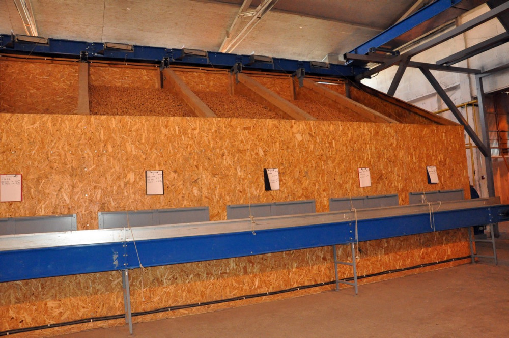Доставленные в цех мойки и сушки орехи поэтапно поступают в два моечных барабана. Вымытые плоды на транспортере направляются на инспекционную линию, где работники предприятия вручную отбирают брак. Качественные орехи следуют на сушку. В ячейках, рассчитанных на две тонны, они обсыхают двое суток при 38 градусах. Регулировка температурного режима осуществляется автоматически, с помощью датчиков.