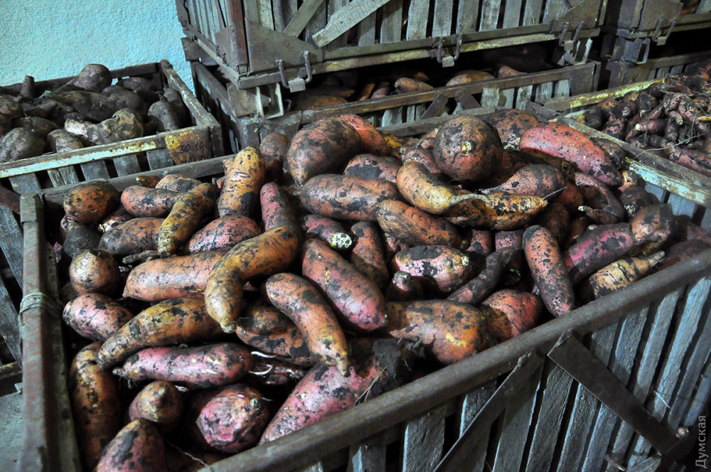 Выкопанный из почвы корнеплод прямиком следует в специальное помещение, которое на предприятии называют «баней». Температура воздуха внутри него колеблется от 27 до 32 градусов. Здесь для батата создаются такие условия, при которых на его тонкой кожице заживают мелкие повреждения.