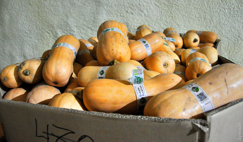 Батат – это культура, которая закрывает сезон сбора урожая на ферме. А перед этим здесь собрали тыкву. Ее, в отличие от батата, возделывают сразу несколько сортов, таких как хоккайдо, мускат, баттернат. Все они отличаются и по внешнему виду, и по вкусу. Тыкву покупатели приобретают охотно.