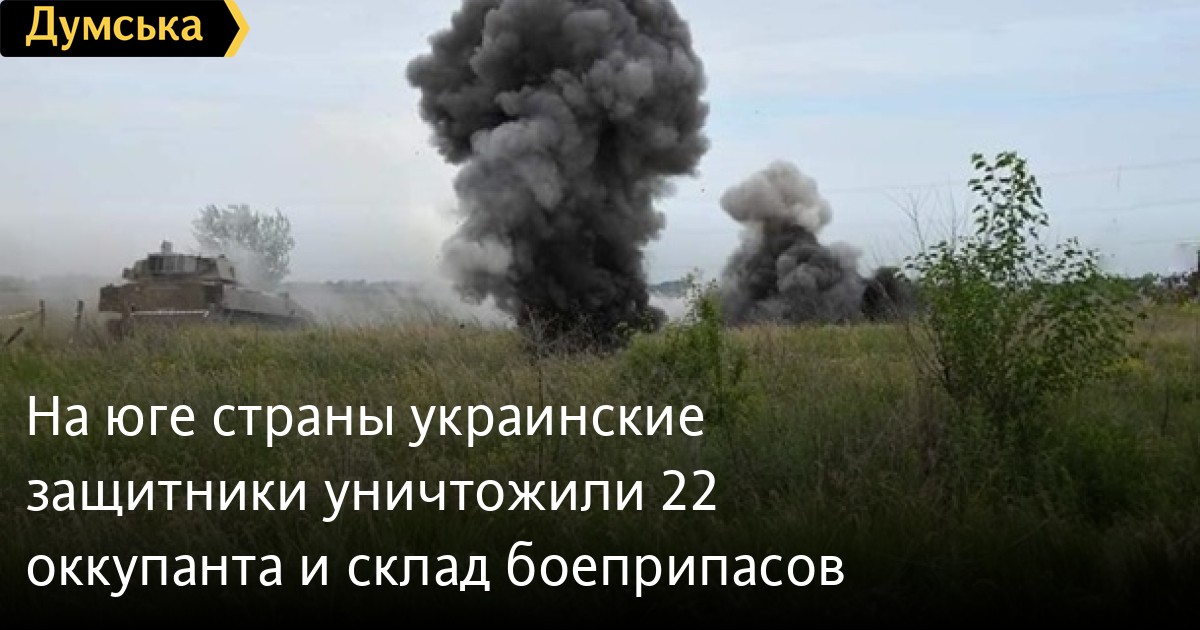 За сутки на юге Украины Вооруженные силы уничтожили 22 российских оккупанта, склад боеприпасов и вражескую технику.