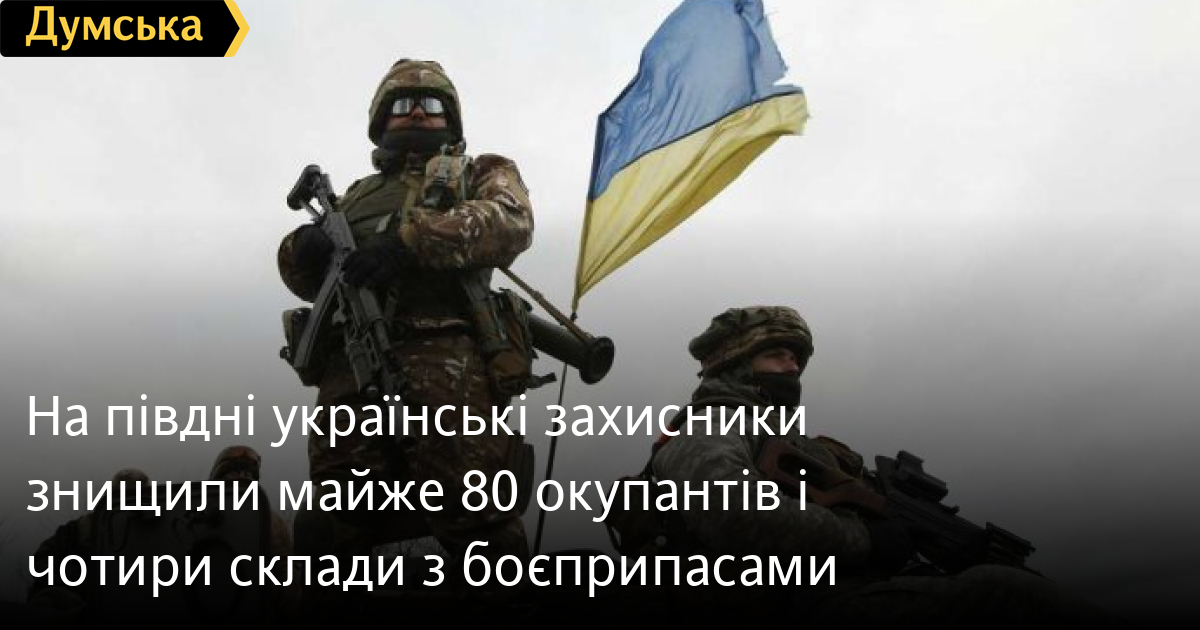 Десятки одиниць ворожої техніки, чотири склади з боєприпасами і 77 російських окупантів знищили українські військові минулої доби на півдні країни.