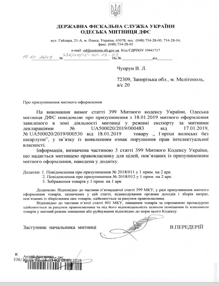 «Они (сотрудники ГФС, — Ред.) останавливают грецкие орехи на основании закона о государственном рыночном надзоре и контроле непищевой (!) продукции, — говорится в одной из публикаций. — Их не волнует, что орехи все-таки пищевая продукция. Более того, не извещая собственников товара и в их отсутствие, с остановленного для оформления груза таможенники берут образцы для непонятно какой экспертизы. Правда, согласно закону (части 21 ст. 356 Таможенного кодекса) после отбора образцов, по согласию декларанта, товар немедленно должен быть выпущен в свободный оборот. Но не на Одесской таможне. В результате экспортеры вынуждены платить взятки, чтобы оформить свой быстропортящийся товар».