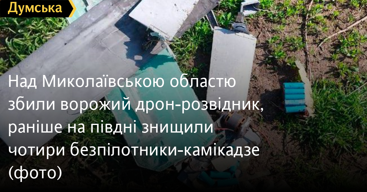 Над Миколаївською областю збили ворожий дрон-розвідник, раніше на півдні знищили чотири безпілотники-камікадзе👍 401 🔥 90 🙏 20 ❤ 10 😁 4 💩 1 Зенітно-ракетна одеська бригада знищила ворожий розвідувальний дрон «Мерлін-ВР» над Миколаївською областю в районі 11:50. Про це повідомили в Повітряному командуванні «Південь». Увечері 22 квітня і вранці 23-го в Миколаївській і Херсонській областях було також знищено чотири ворожі дрони-камікадзе типу «Ланцет». СМЕРТЬ РОСІЙСЬКИМ ОКУПАНТАМ! Помітили помилку? Виділяйте слова з помилкою та натискайте control-enter |