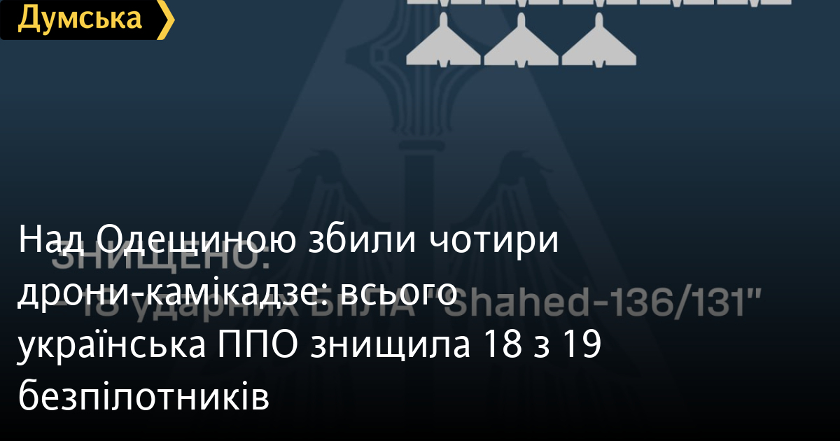 Над Одещиною збили чотири дрони-камікадзе: всього українська ППО знищила 18 з 19 безпілотників19 ударними Shahed-131/136 атакували Україну російські нацисти. Запускали дрони з окупованого Криму (райони пусків – Чауда, Балаклава), повідомили в Повітряних силах. 18 безпілотників збили в небі Одеської, Херсонської, Дніпропетровської, Вінницької, Хмельницької, Київської, Чернігівської та Кіровоградської областей. За повідомленням Сил оборони, 10 «пташок» знищили над півднем України. Шість — над Херсонщиною, чотири — над Одещиною та один — над Кіровоградщиною. Влучань в цих регіонах не було. СМЕРТЬ РОСІЙСЬКИМ ОКУПАНТАМ! Помітили помилку? Виділяйте слова з помилкою та натискайте control-enter Новини по цій темі: 1 січня: Нічний удар по Одещині: пошкоджено енергетичну інфраструктуру та житлові будинки (фото, відео) 31 грудня 2025: Новорічний наліт: Одеса під ударом російських шахедів 25 грудня 2025: Ворог вночі атакував Одеську область: одна людина загинула, двоє отримали поранення (фото) 23 грудня 2025: Ворог атакував південь Одещини: пошкоджено суховантаж, приватні будинки та енергооб'єкт (фото) 22 грудня 2025: Ворог вночі атакував Одесу: постраждав чоловік, частина Пересипського району залишилася без світла |