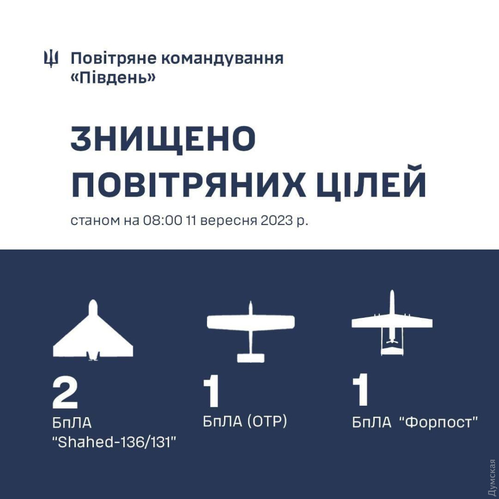 Підрозділи ППО збили вночі 11 вересня російський дрон-розвідник «Форпост» над Одеською областю.