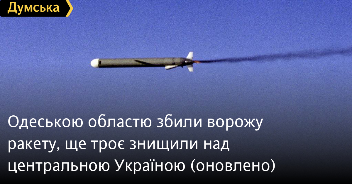 Одеською областю збили ворожу ракету, ще троє знищили над центральною Україною (оновлено)Сили ППО Повітряного командування «Південь» збили над Одеською областю ворожу ракету «Калібр». В одеській міськраді повідомили, що ракету знищили близько 10:00. «Калібр» був запущений з російського підводного човна в акваторії Чорного моря. ОНОВЛЕНО О 13:59. Генеральний штаб Збройних сил України повідомив, що ще три «калібри» були знищені над центральною Україною. СМЕРТЬ РОСІЙСЬКИМ ОКУПАНТАМ! Помітили помилку? Виділяйте слова з помилкою та натискайте control-enter |
