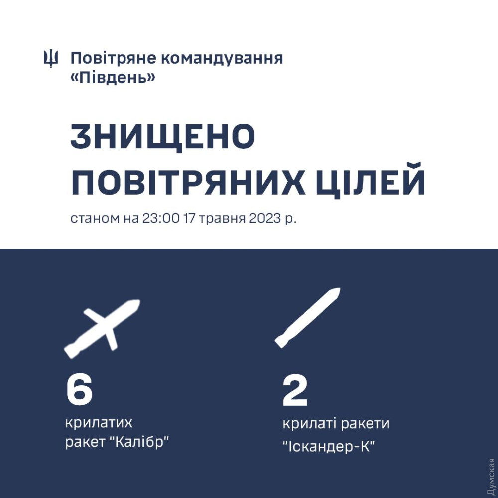Всі вісім крилатих ракет, випущені по Одещині в ніч проти 18 травня, знищені силами та засобами ППО.