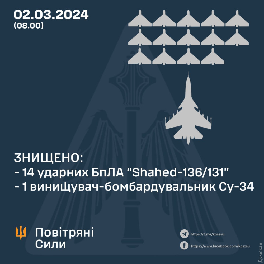 У Повітряних силах Збройних сил України також повідомили, що вранці 1 березня на Донбасі було збито чергового російського винищувача-бомбардувальника Су-34.