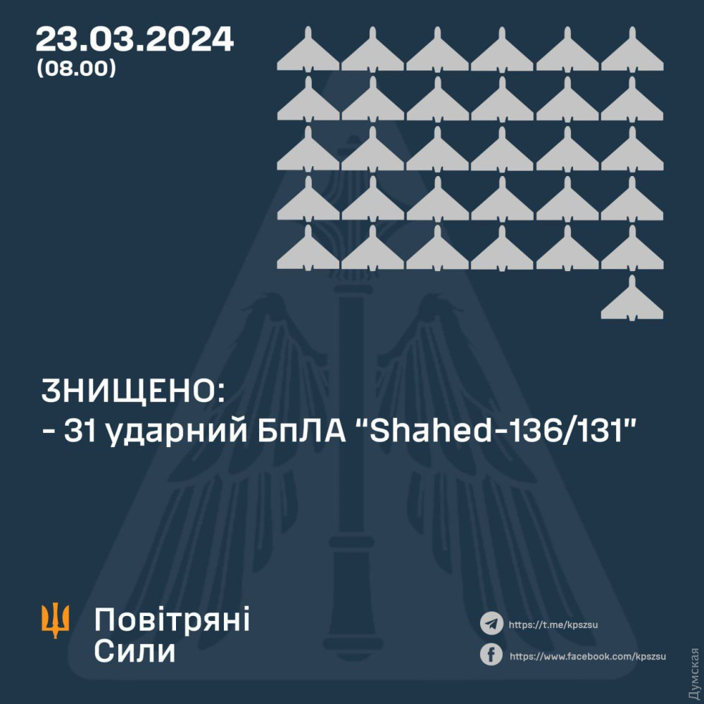 Окупанти атакували Україну 34 дронами-камікадзе Shahed-136 уночі 23 березня. 31 безпілотник вдалося збити, повідомили в командуванні Повітряних сил Збройних сил України. Дрони летіли з Курської області, а також з мису Чауда в окупованому Криму. Крім того, вороги використали чотири ракети С-300, якими вдарили по Донецькій області. СМЕРТЬ РОСІЙСЬКИМ ОКУПАНТАМ! Помітили помилку? Виділяйте слова з помилкою та натискайте control-enter |