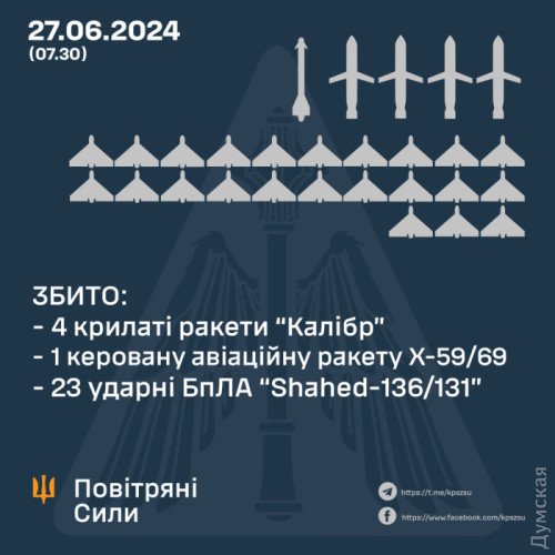28 повітряних цілей збили над Україною вночі 27 червня. Загалом ворог випустив по нашій країні шість ракет різних типів і 23 Shahed, повідомили в Повітряних силах.