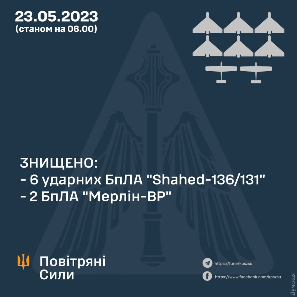 Шість дронів-камікадзе Shahed-136 знищили сили ППО в українському небі протягом 22 травня. Про це повідомили в командуванні Повітряних сил Збройних сил України. Крім того, наші зенітники приземлили два розвідувальні БПЛА типу «Мерлін-ВР». СМЕРТЬ РОСІЙСЬКИМ ОКУПАНТАМ! Помітили помилку? Виділяйте слова з помилкою та натискайте control-enter |