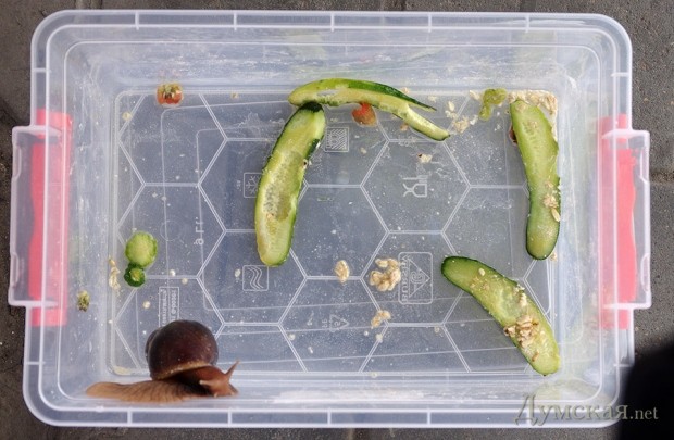 Своих питомцев Надя держит в обычном пластиковом контейнере, кормит овощами и фруктами, постоянно следит за влажностью и за тем, чтобы улитки не находились долго под открытым солнцем.