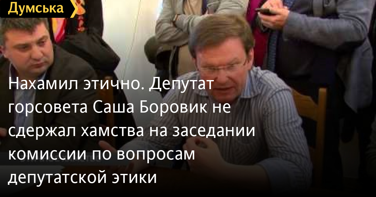 Нахамил этично. Депутат горсовета Саша Боровик не сдержал хамства на заседании комиссии по вопросам депутатской этикиХамство без рамок. В Одесском городском совете состоялось заседание комиссии по этике, на которой попытались проанализировать поведение депутата Дмитрия Палпатина, вынесшего Сашу Боровика из зала в ходе минувшей сессии. Собрание прошло на повышенных тонах. Подробности знает Юлия Долганюк. СМЕРТЬ РОССИЙСКИМ ОККУПАНТАМ! Заметили ошибку? Выделяйте слова с ошибкой и нажимайте control-enter Думская ТВ. Сюжеты: