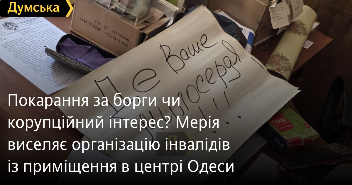 Покарання за борги чи корупційний інтерес? Мерія виселяє організацію інвалідів із приміщення в центрі Одеси«Товариство інвалідів «Жовтневий» намагаються виселити з приміщення на Європейській, 48 після двадцяти років оренди. У товаристві переконані, що чиновники хочуть позбавити їх приміщення, щоб здати його в комерційних цілях, а в мерії пояснюють — договір оренди закінчився ще у 2020 році. У ситуації розбирався кореспондент «Думської». Невелике приміщення (49,7 кв.м.), в якому розташовується офіс громадської організації, має фасадне розташування. Там є приймальня, складська кімнатка та туалет. Сьогодні тут людно: всередині та зовні зібралося понад десяток громадян, які прийшли висловити свій протест співробітникам виконавчої служби, які мали проводити виселення. «Щоп'ятниці тут безкоштовно видають хліб, надають найрізноманітнішу консультаційну допомогу, — каже одеситка Лілія Садовська. Це може здатися дрібницею, але з нашими пенсіями знати, що хоча б раз на тиждень не доведеться витрачати гроші на хліб це теж чимало. Також періодично дають борошно, ліки, одяг, який передають гуманітарні організації. І ось тепер організацію хочуть закрити, позбавити нас приміщення». Голова товариства Ярослав Толмачов каже, що протистояння з департаментом соціальної політики почалося у 2024 році, коли чиновники вимагали не тільки виселитися, а й погасити борги у розмірі майже девяти тисяч гривень. «Наша організація розташовується тут з 2005 року, ми завжди були у переліку тих, хто орендував муніципальне приміщення за 1 гривню на рік, — розповідає він. Щороку цей термін продовжувався рішенням сесії або, якщо такого не ухвалено, автоматично. Однак у 2024 році нас запросили до Господарського суду Одеської області та повідомили про те, що департамент комунальної власності хоче нас виселити, оскільки договір оренди закінчився ще у 2020 році й не був продовжений, у звязку з чим ми заборгували 8757 гривень. Ми навели свої аргументи, до яких суд прислухався і відмовив департаменту: ми не є прибутковою організацією та субєктом господарського права, у звязку з чим суд не може ухвалювати щодо нас будь-яких рішень. Крім того, щодо боргу минув строк позовної давності, який становить три роки. Проте департамент знову подав до суду, який відбувся без нашої участі, і домігся свого рішення про наше виселення». Ми звернулися до департаменту комунальної власності, де послалися на рішення Господарського суду Одеської області. Дійсно, чиновники вимагали виселення «Жовтневого» та розірвання договору від 2004 року. Ще в червні 2025 року суддя Тетяна Деркач частково задовольнила вимоги мерії та постановила виселити громадських діячів, а у виплаті компенсації у розмірі майже девяти тисяч гривень відмовила. Натомість вони мають сплатити три тисячі гривень судового збору. Як нам пояснили, після змін у законодавстві організація перестала входити до переліку субєктів, продовження договору оренди з якими може відбуватися у форматі «мовчазної згоди». Термін дії закінчився 31 грудня 2020 року і не був продовжений, після чого, з огляду на продовження користування приміщенням, «Жовтневому» почали нараховувати щомісячну таксу за користування 474,5 грн. Оплати не було більше трьох місяців, що дозволило департаменту вимагати виселення громадських діячів. У товаристві інвалідів мають нам