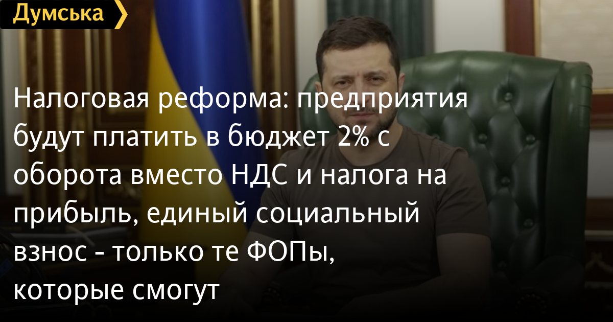 «Вместо НДС и налога на прибыль вводится ставка 2% от оборота и упрощенный учет. Для малого бизнеса — а это первая и вторая группы ФОПов ставим добровольную оплата единого социального взноса. Если можете — платите. Если нет - без вопросов», — отметил Зеленский.