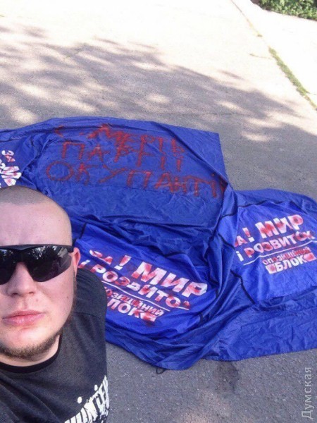 Кроме того, они сожгли у дверей помещения палатку этой политической силы, довольно толерантно относящейся к российской агрессии в Крыму и на востоке Украины.