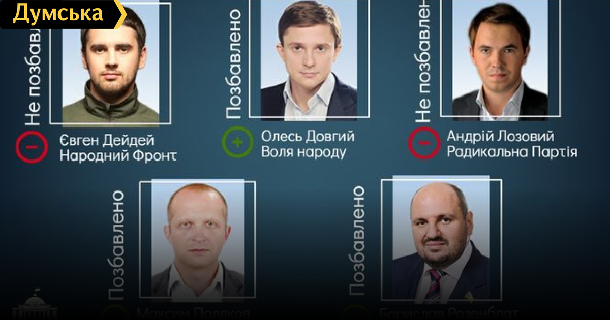 11 июля Верховная Рада рассматривала внесенные Генпрокуратурой запросы на снятие депутатской неприкосновенности с депутатов Евгения Дейдея, Олеся Довгого, Максима Полякова, Андрея Лозового и Борислава Розенблата.