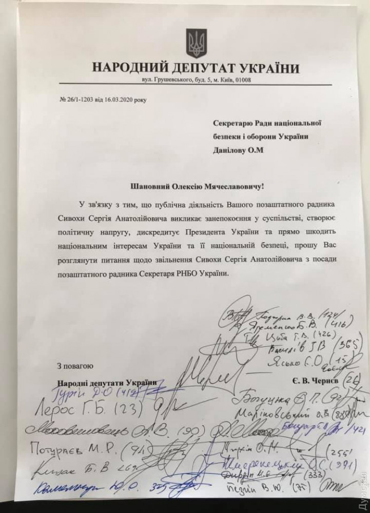 «Публичная деятельность Сивохо вызывает беспокойство в обществе, создает публичное напряжение, дискредитирует президента и вредит национальным интересам Украины», — говорится в обращении.