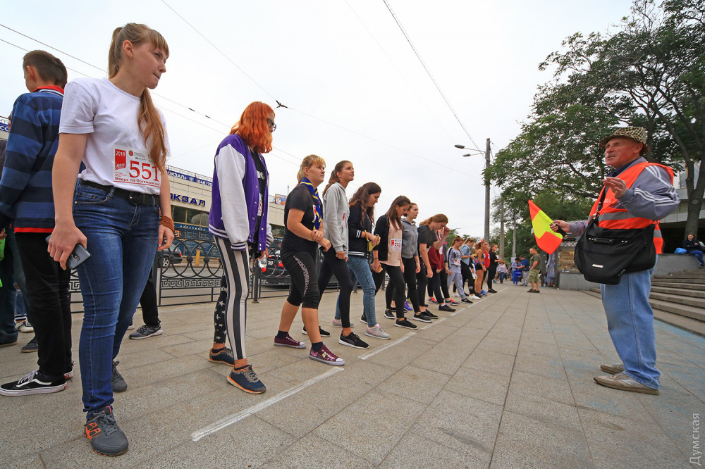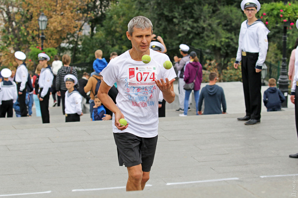 Всего по Потемкинской сегодня пробежали более 30 групп спортсменов. Побить рекорды, к сожалению, никому не удалось. Последним поднялся жонглер-любитель из Черноморска, который по время своего шуточного забега жонглировал тремя теннисными мячами.