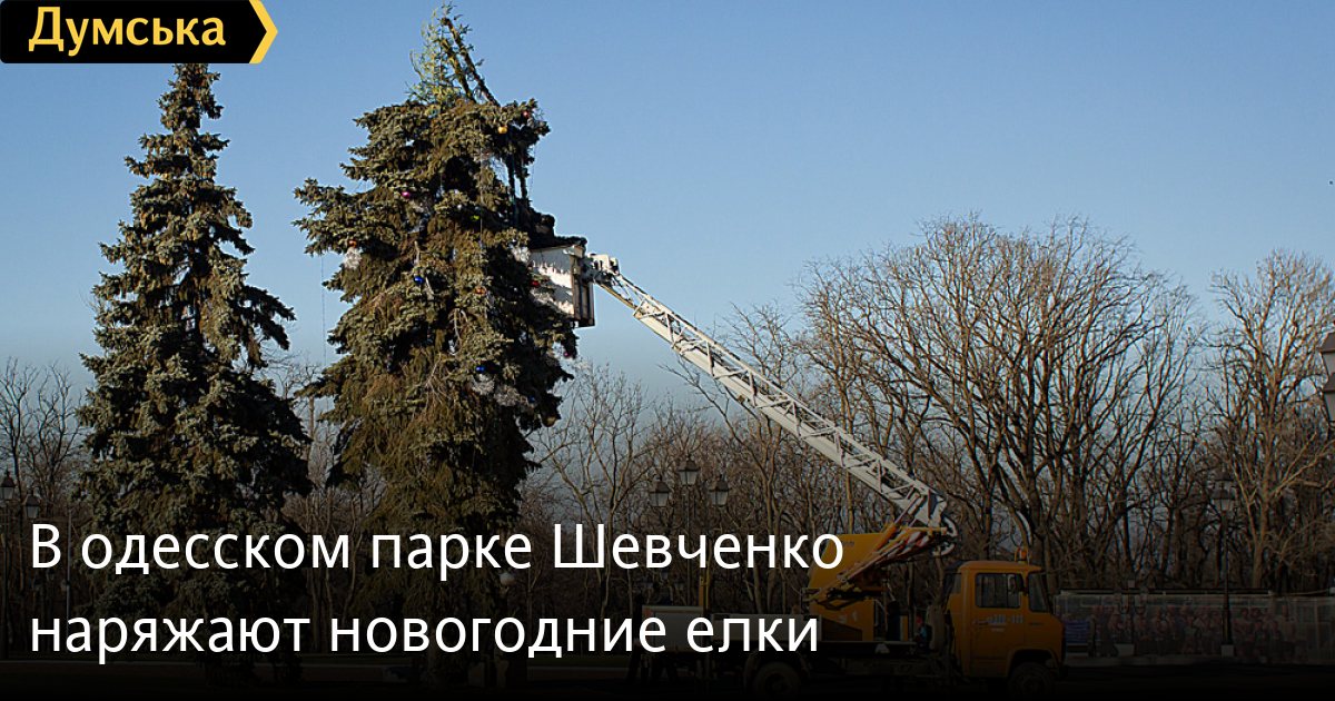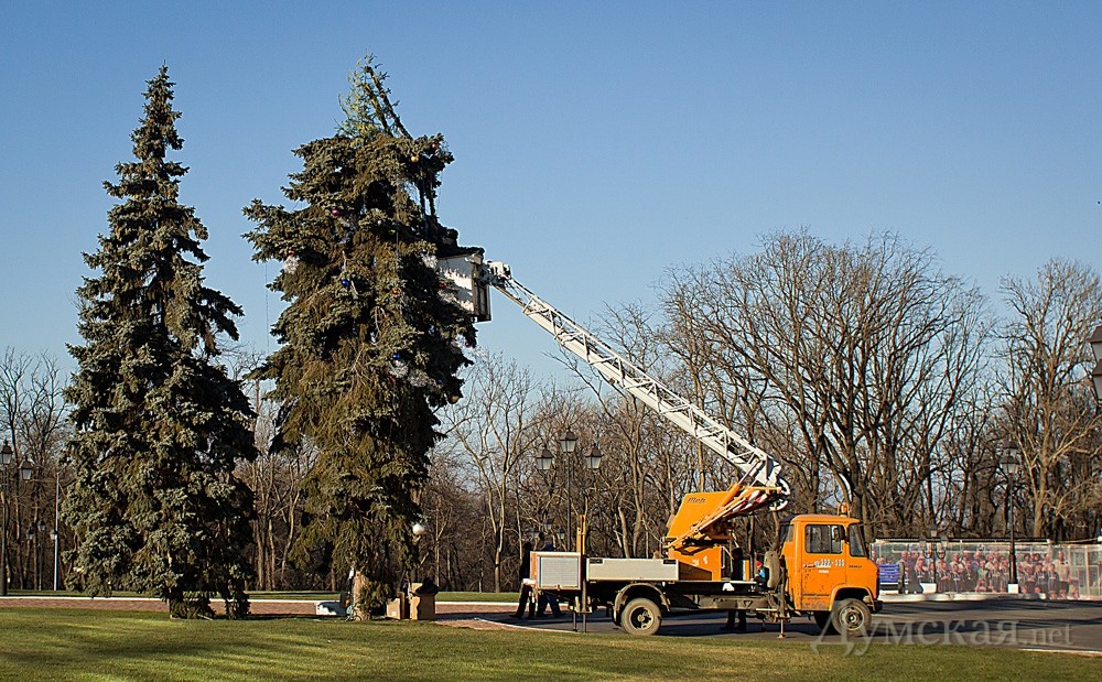 Одесса вовсю готовится к празднованию Нового года. Первая елка появилась на Привозе еще на прошлой неделе. Вот-вот зажгутся огни на главной зеленой красавице города на Думской площади — сегодня коммунальщики закончили монтаж, на завтра назначено торжественное открытие. Еще одна скоро появится на Дерибасовской. А тем временем возле стадиона «Черноморец» в парке Шевченко тоже наряжают свой символ праздника. Здесь, правда, не устанавливают никаких каркасов и прочих конструкций, а украшают то, что есть под рукой — две большие ели, которые растут здесь же. Чтобы развесить на ветках праздничные шарики и гирлянды, используют кран.