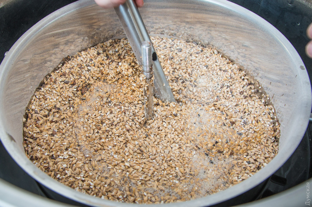 Для сегодняшнего эксперимента Иван отобрал восемь видов солода разной степени прожарки. У каждого — свой аромат и вкус, а зерна вполне можно щелкать, как семечки. Технолог пропускает душистые ферментированные зерна через специальную дробилку. Помол должен быть не сильно грубым и не сильно мелким, чтобы оставшаяся шелуха послужила естественным фильтром для готового сусла.