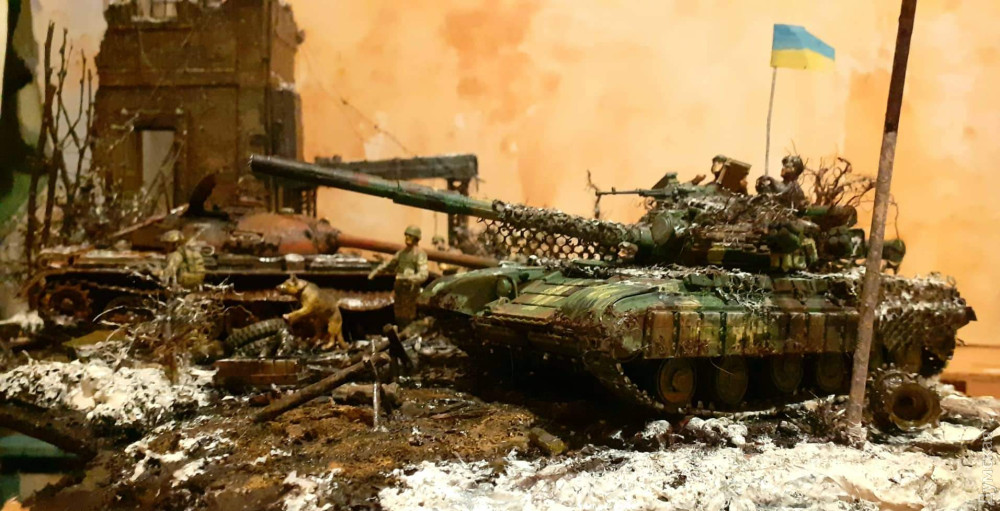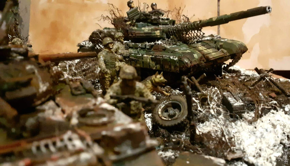 Біля розбитої артилерією будівлі стоїть російський танк Т-62, що згорів, а знищений блокпост оглядають захисники України – всього вісім мініатюрних фігурок, включаючи собаку. Неподалік припаркувався український танк Т-64БВ із екіпажем. Над ним майорить синьо-жовтий стяг нашої країни.