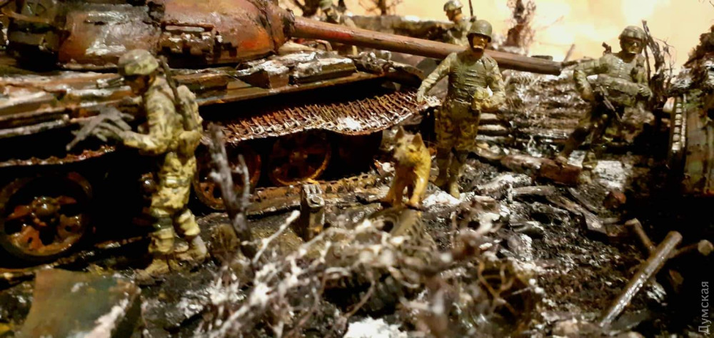 «Раніше я робив діорами для нашого музею на 411-й батареї, – каже Василь Прокоф'єв. – Два тижні тому до мене звернувся мій друг дитинства та попросив зробити мініатюру щодо сучасних подій. Сплатив роботу та матеріали, дав повну свободу. Я добряче попрацював над пейзажем, постарався передати атмосферу березня 2022 року. Це збірний образ. Я втілив у діорамі всі свої враження за сім місяців війни, всі ті новини, які читав чи дивився на Ютубі, і те, що ми відчуваємо тут. Сподіваюся, у мене вийшло».