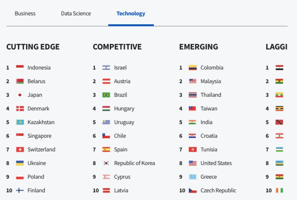В категории стран-лидеров Украина заняла 21 место. А в рейтинге по технологическим компетенциям — восьмое.