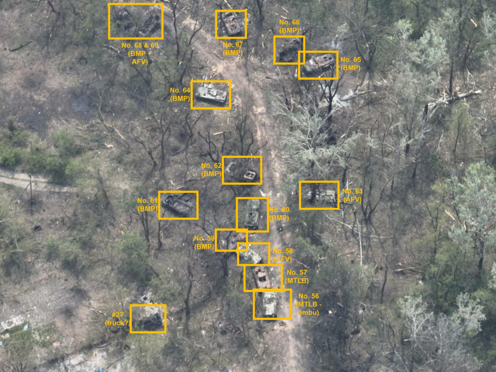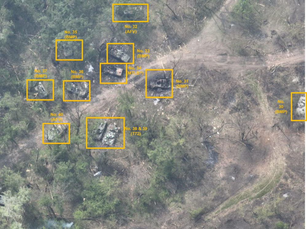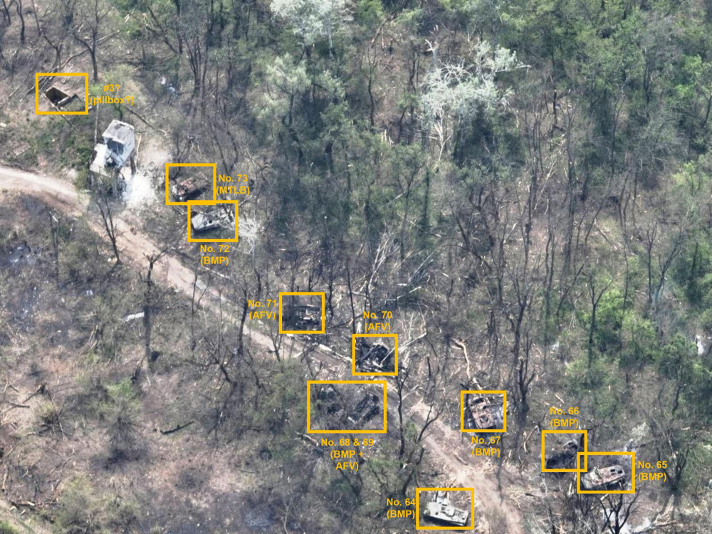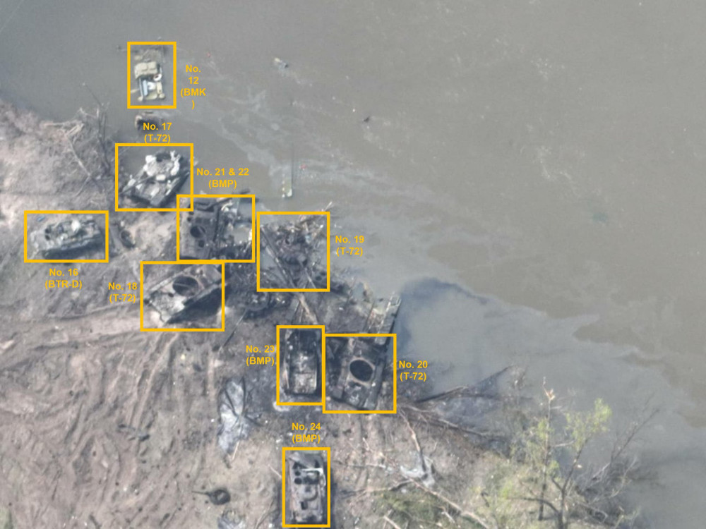 Эти данные подтверждают специалисты по изучению открытых источников. OSINT-исследователи насчитали на снимках, сделанных 8 мая, 73 единицы техники. Они идентифицировали танки Т-72, бронемашины БМП и БМД, бронетранспортеры, автомобили и специальную технику. По всей видимости, еще какое-то количество вражеского вооружения затонуло. Уничтоженной техники хватило бы для целой батальонной тактической группы.