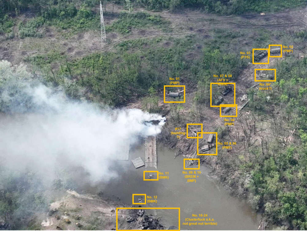 Как сообщает сообщество InformNapalm, после мощнейшего удара днем 8 мая, которым был полностью уничтожен временный мост, через реку успел перебраться российский десант. Оставшись без бронетехники, солдаты рассеялись на южном берегу.
