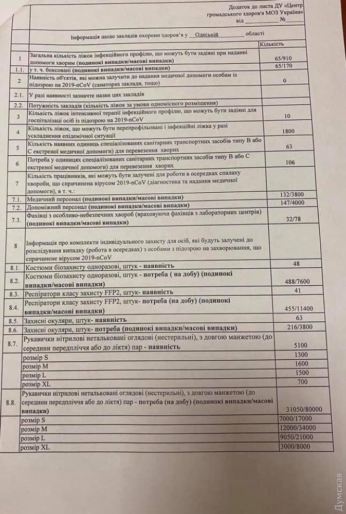 Информации о количестве аппаратов искусственной вентиляции легких, без которых невозможно спасать людей с осложнениями COVID-19, в справке нет. В областной государственной администрации нам сообщили, что на весь регион, без Одессы, таких устройств 72. Еще 64 находятся в коммунальных медучреждениях города. Всего, выходит, 136 аппаратов.