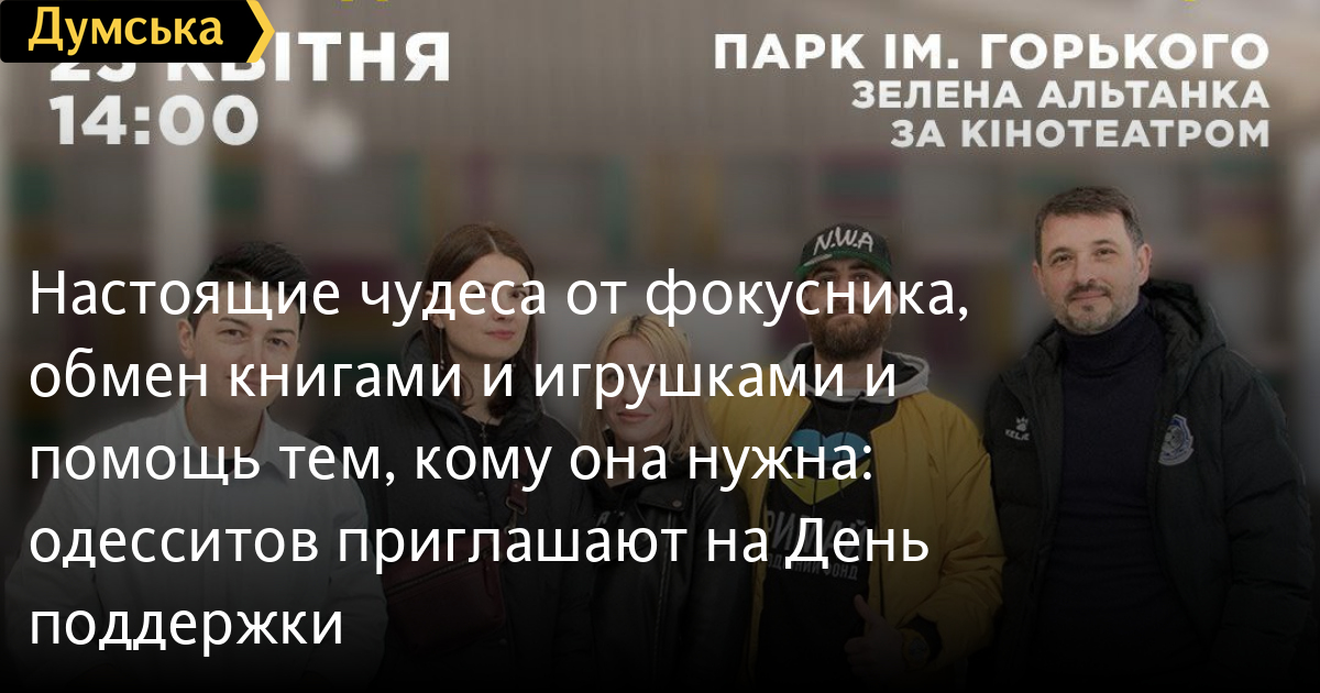 Справжні дива від фокусника, обмін книгами та іграшками й допомога тим, кому вона потрібна: одеситів запрошують на День підтримкиДень підтримки від благодійного фонду «Тримай» відбудеться 23 квітня в парку Горького. Організатори запрошують всіх одеситів, хто хоче гарно провести час, допомогти армії, взяти участь у цікавих проєктах, приєднатися до цієї події. Гостей чекатимуть справжні дива від фантастичного фокусника Олександра Яременко. Ба більше, глядачі зможуть самі взяти участь у чаклуванні. А обласний центр фізичного здоров'я населення ''Спорт для всіх» підготував веселе спортивне свято для всієї родини. Окрім розваг, під час заходу відбудеться роздача продуктових наборів і засобів гігієни переселенцям (за попередньою реєстрацією у чаті 7:40), а також каші, суміші, смачненькі пасочки для дітей, які втекли від війни (після реєстрації для ВПО). Кожен, хто хоче не тільки гарно провести час, а ще й з користю, може взяти участь в декількох благодійних акціях, які проходитимуть в рамках Дня підтримки. Перша акція — «Вільні іграшки», всі охочі можуть принести іграшку, пазли або ігри і обміняти на те, що принесуть інші діти. Ще одна корисна акція — «Вільні книжки». Якщо у вас є книги, які лежать без діла, їх можна принести та обмінятися з іншими читачами. До того ж організатори збирають продукти для наших залізних Збройних сил та відсилають їх на фронт. Це - День підтримки ЗСУ. Крім того, допомогти можна й мирним мешканцям, які живуть під обстрілами. Приносьте все: від круп до побутової хімії. В рамках проєкту «Прифронтовий» все це спакують у посилки і доставлять до адресатів. Не залишаться без уваги й брати наші менші — одесити можуть принести корм для тварин, який передадуть волонтерам, що опікуються покинутими тваринами в Одесі, прифронтових та гарячих точках. Все це чекає на вас у парку Горького (зелена альтанка за кінотеатром, вхід з Варненської вулиці). Початок заходу о 14:00. Вхід вільний. Без реєстрації. СМЕРТЬ РОСІЙСЬКИМ ОКУПАНТАМ! Помітили помилку? Виділяйте слова з помилкою та натискайте control-enter |