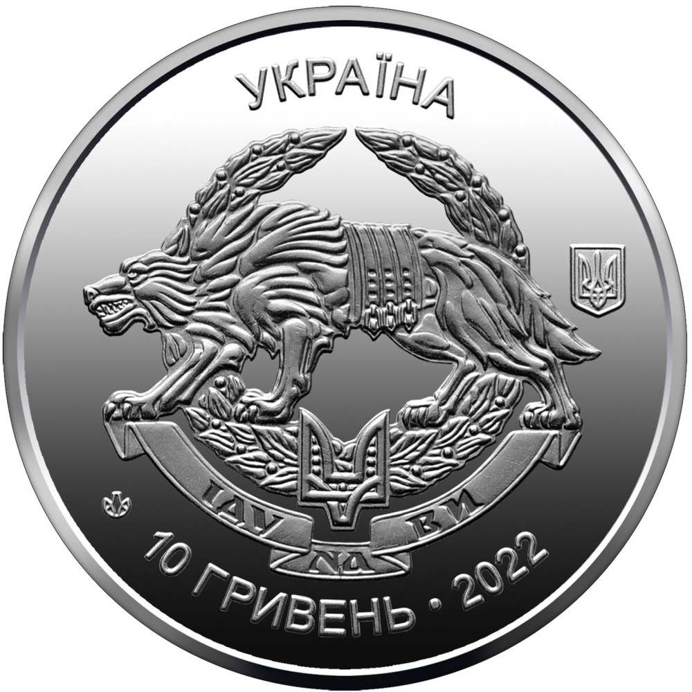 На аверсі монети розміщена емблема Сил спеціальних операцій ЗСУ, срібний вовк накладений на вінок з лаврового листя, в центрі якого — двозуб – княжий знак Святослава Хороброго.