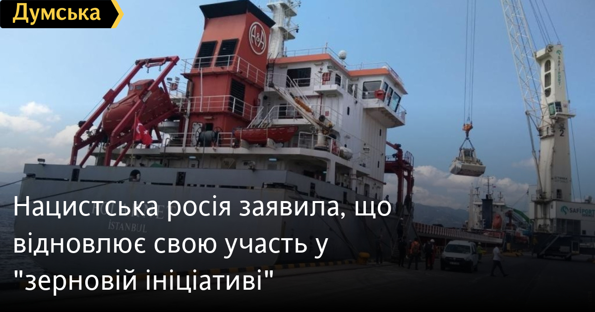 російська федерація відновлює свою участь у так званій «зерновій ініціативі», яка була припинена після успішної атаки безпілотними апаратами головної бази чорноморського флоту в тимчасово окупованому Криму.