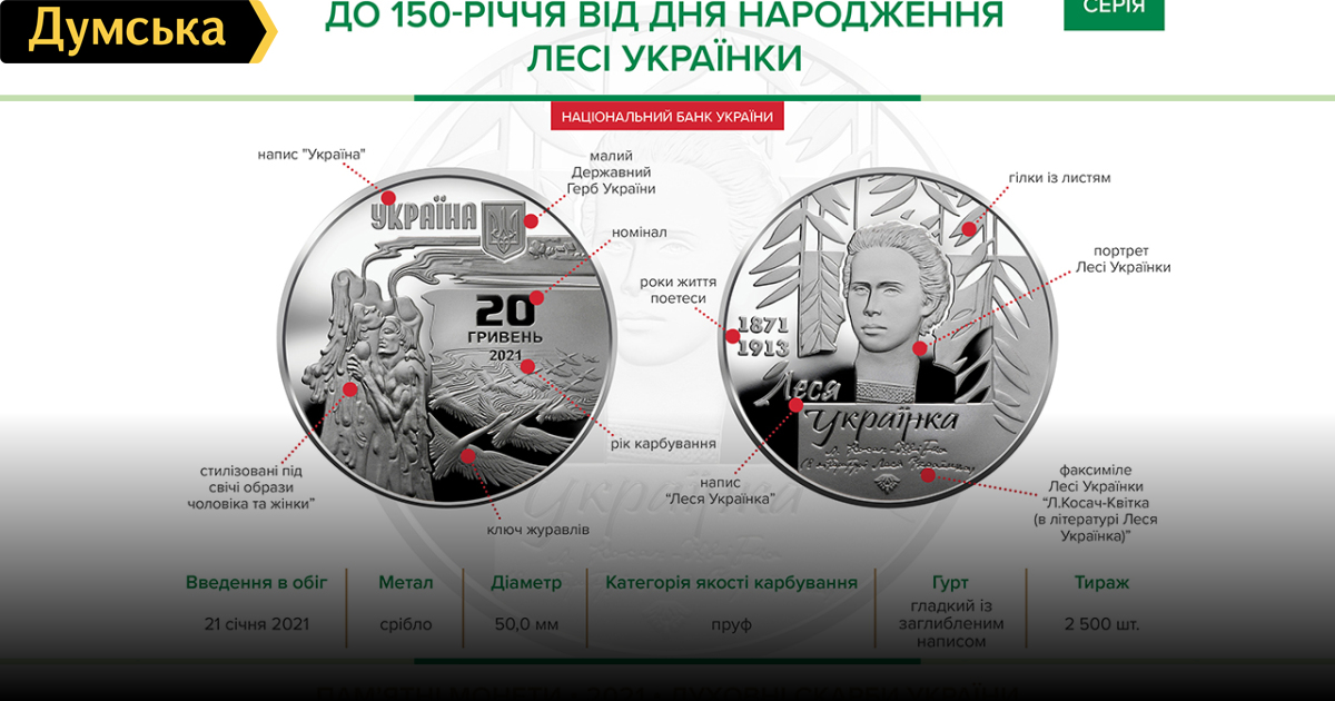 Национальный банк Украины вводит в обращение с 21 января текущего года памятную монету «К 150-летию со дня рождения Леси Украинки». Об этом сообщила пресс-служба НБУ. Монета будет сделана из серебра, номиналом 20 грн. Она будет посвящена украинской поэтессе, драматургу, переводчице, литературному критику и общественному деятелю — Лесе Украинке (Лариса Петровна Косач). «Леся Украинка — один из самых выдающихся украинских художников слова. Многогранный талант писательницы отобразился в самых разнообразных жанрах — лирике, эпосе, драме, прозе, публицистике. Ее творчество полно глубоких патриотических чувств к Украине», — сказано в сообщении НБУ. На аверсе монеты вверху размещена надпись УКРАИНА, справа от которой малый Государственный Герб Украины; и композиция, символизирующая яркий, эмоциональный, богатый мир поэзии Леси Украинки. Слева на зеркальном фоне — стилизованные под свечи образы мужчины и женщины; справа — ключ журавлей, над которым номинал и год чеканки монеты 20/ГРИВЕНЬ/2021. На реверсе монеты на фоне стилизованных веток с листьями изображен портрет Леси Украинки; слева — годы жизни 1871/1913; надписи: Леся Украинка (под портретом), Л. Косач-Квитка. СМЕРТЬ РОСІЙСЬКИМ ОКУПАНТАМ! Помітили помилку? Виділяйте слова з помилкою та натискайте control-enter |