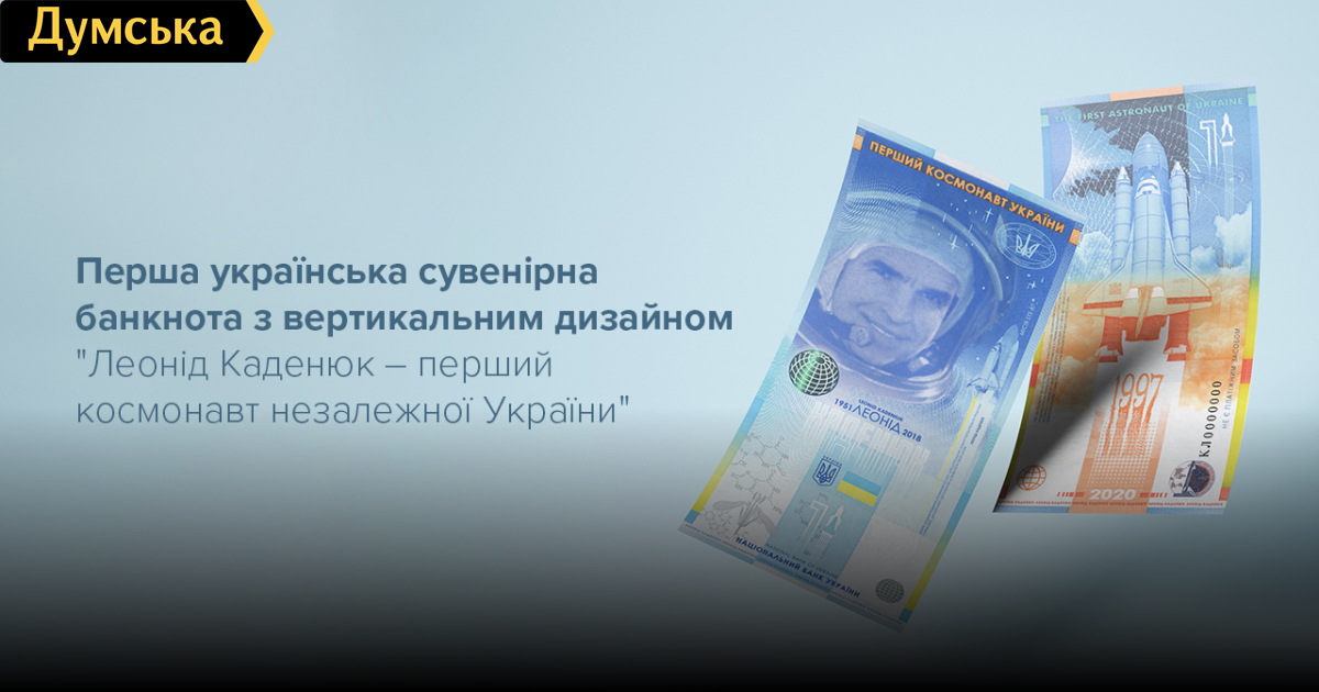 Банкнота называется «Леонид Каденюк — первый космонавт независимой Украины». Это первая сувенирная банкнота с вертикальным дизайном.