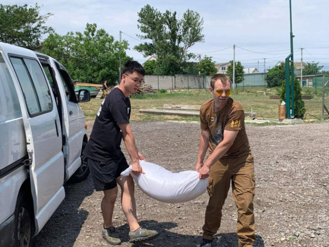 - Ми були десь за п'ять кілометрів від «нуля», — згадує Юкі. — Відвозили гуманітарку. Дуже голосно! Відчувається вібрація від прильотів. На стінах будинків брудна лінія — це рівень води, що зійшла після вибуху дамби Каховського водосховища. Привезли генератор, речі, продуктові набори. І звичайно, ми приїхали підтримати морально людей. А це священнослужителі, волонтери, їм дуже важко, вони постійно в небезпеці й перебувають в ізоляції. І ми хотіли показати, що з ними!