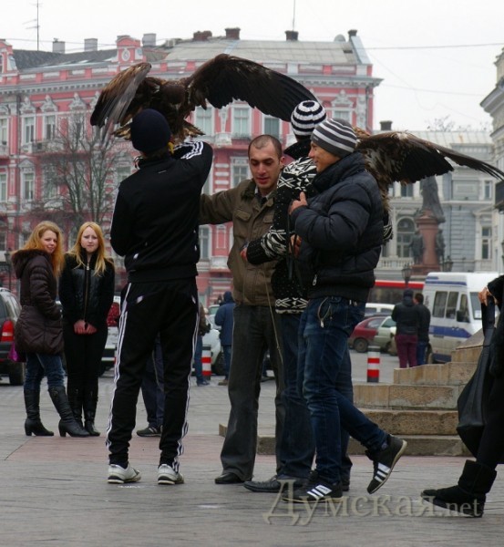 Убежав от мэра, мучители орлов снова предлагают свои услуги прохожим, демонстрируя тем самым тотальную неспособность городского головы к контролю за происходящим. Какая уж здесь «принципиальная позиция» в борьбе с застройкой склонов, если даже два гопника с орлами в руках — нерешаемая задача