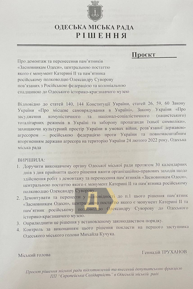 Проєкт рішення про демонтаж одеських пам'ятників Катерині II та Олександрові Суворову (копія ізмаїльського монумента, встановлена 2012 року біля «Молодої гвардії») і перенесення їх в історико-краєзнавчий музей винесла на розгляд міськради фракція «Європейської Солідарності».